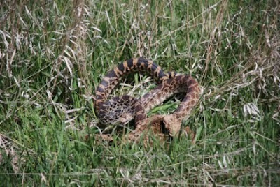 As we approached my husband, he stood stopped in the middle of the road and kept looking at us, then toward the fence repeatedly. I assumed he found a fawn in the grass, but no. He’d stepped on the tail of a bull snake that was REALLY mad by the time we got there, and my husband kept it provoked while waiting for us, so he could show it to us.